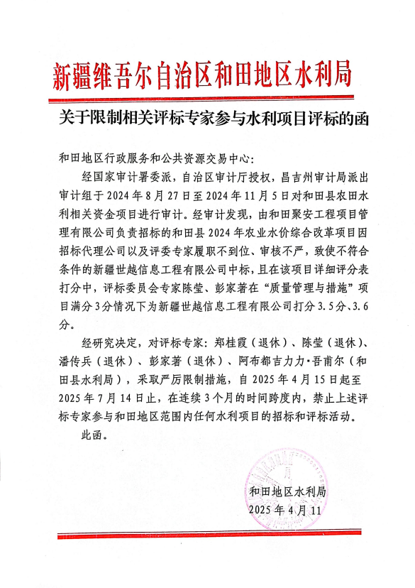 关于限制相关评标专家参与水利项目评标的函