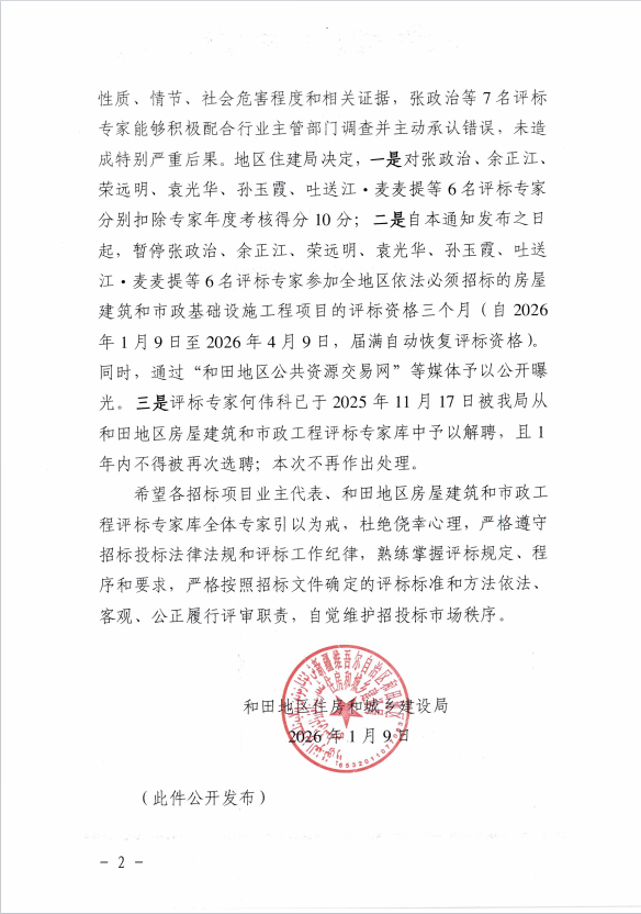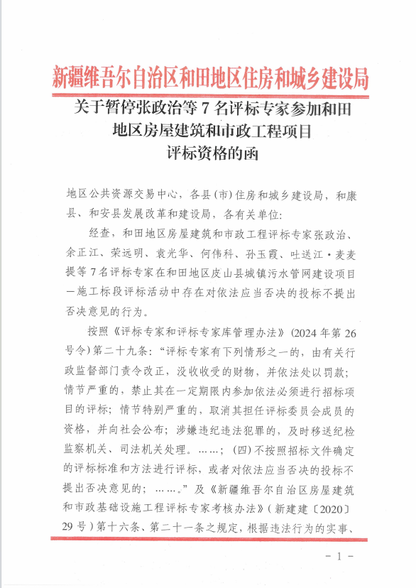 关于暂停张政治等7名评标专家参加和田地区房屋建筑和市政工程项目评标资格的函