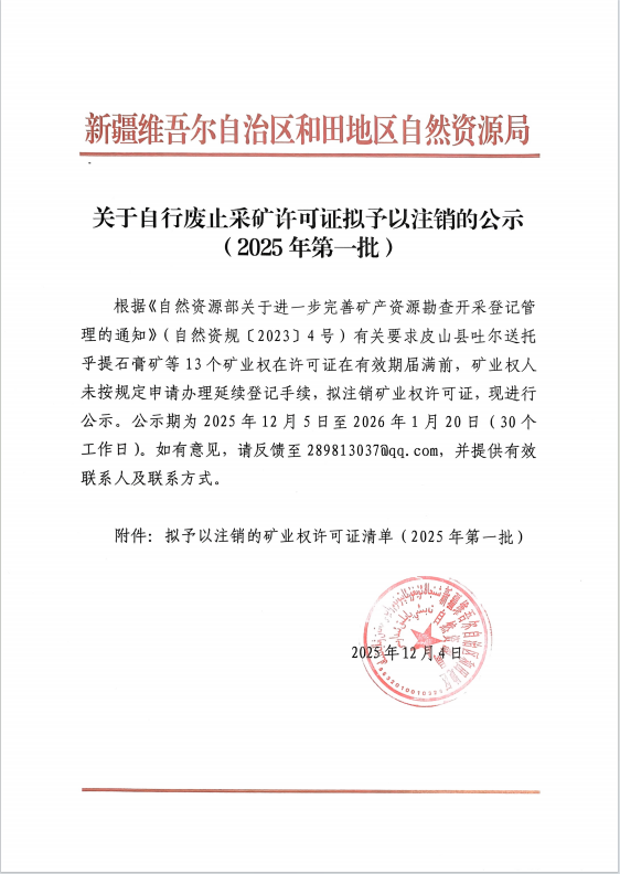 关于自行废止采矿许可证拟予注销的公示(2025年第一批)
